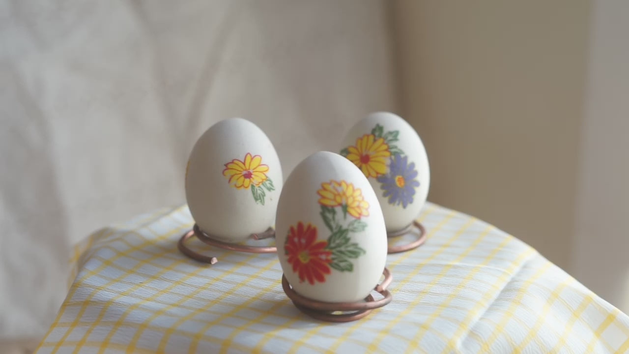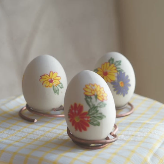 The nest eggs are hand decorated with floral motifs making it very visible in the nesting box. Each egg is has a different pattern, cute enough to display. Still eggy enough, however, that it gives chickens the right idea. These eggs will easily wipe clean and are also made from the same durable stoneware ceramic as the feeders.